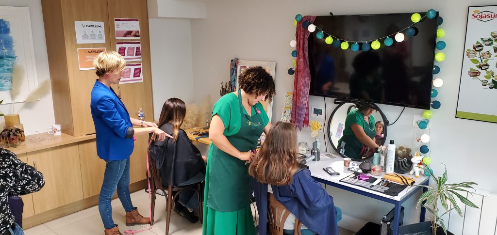 Cette année ce n’est pas un mais DEUX salons de coiffures éphémères que nous avons réussi à mettre en place : un sur notre siège social et le second dans un de nos ateliers de production pour faciliter la participation de tous les collaborateurs motivés !